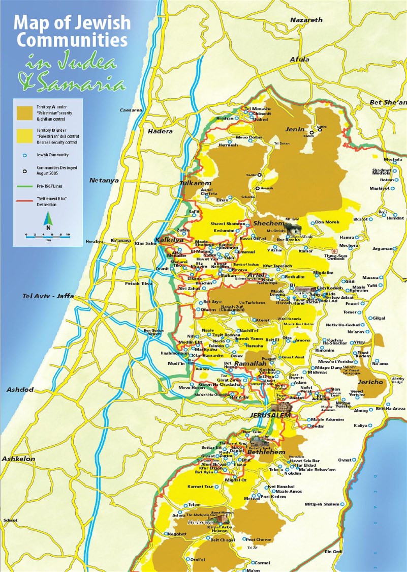 The map of Israel reflects the staged transfers of land from Israel to the Palestinian Authority since 1993. Area A refers to land that was transferred completely to the Palestinian Authority (“PA”). These areas became terrorist hotbeds of activity and it was only in 2003 that the Israeli army began entering these areas in order to combat the terrorism threat. Area B includes land that was jointly controlled by the PA and Israel; here, too, most of that cooperation was destroyed in 2000, although the PA is still responsible for all civilian issues in both areas A and B. Recently, the PA has begun to cooperate with the IDF to keep the area safe, for both Arabs and Jews. But it is clear to both Arabs and Jews that without a strong IDF presence, terrorism would once again rear its head with more power than ever before. Area C is still within exclusive Israeli control. All remaining Jewish communities in Judea and Samaria as well as the main roads leading to them, remain within Israeli control, although many are isolated and surrounded by Palestinian-controlled areas.